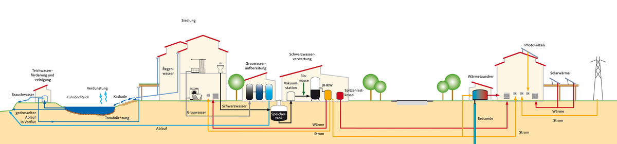 Das technische Entwässerungskonzept sieht eine getrennte Ableitung von Toilettenwasser (Schwarzwasser) und sonstigem häuslichen Abwasser (Grauwasser) vor. Das Grauwasser soll energiesparend dezentral behandelt und an die Gewässer abgegeben werden. Das Schwarzwasser wird mit Vakuumtechnik konzentriert erfasst und in einer Biogasanlage gemeinsam mit organischen Abfällen behandelt. Das dabei produzierte Biogas wird in einem Block-Heizkraftwerk in Elektrizität und Wärme umgewandelt. Aus den Reststoffen der Biogasanlage (Gärresten) sollen hochwertige Produkte zur Bodenverbesserung und Düngung hergestellt werden.