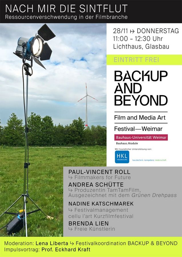 Am Donnerstag, den 28. November 2019 lädt das Film and Media Art Festival—Weimar »Backup and Beyond« alle Interessierten ein mit Aktivisten und Filmschaffenden über nachhaltige Maßnahmen in der Filmindustrie zu diskutieren. Teil des Panels ist ein Impulsvortrag von Prof. Eckhard Kraft, Professur Biotechnologie in der Ressourcenwirtschaft.