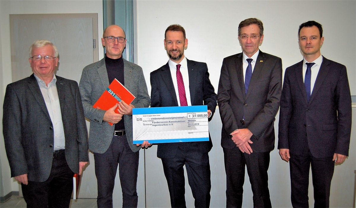 Die Aus-und Weiterbildung hochqualifizierter Fachkräfte ist Kernaufgabe des Instituts für Konstruktiven Ingenieurbau (IKI) an der Bauhaus-Universität Weimar. Als Lehr- und Forschungseinrichtung trägt das IKI hierbei maßgeblich zur Profilbildung der Fakultät Bauingenieurwesen bei. Unterstützt wird das Institut vom Förderverein Konstruktiver Ingenieurbau e.V., dem nun eine Spende durch mehrere Prüfingenieurinnen und Prüfingenieure für Baustatik des Landes Thüringen zu Teil wird. Mit der finanziellen Unterstützung sollen die Leistungen des IKI gewürdigt und Mittel für die Nachwuchsförderung konstruktiv tätiger Bauingenieurinnen und Bauingenieure bereitgestellt werden. Im Namen der Bauhaus-Universität Weimar bedankte sich Präsident Prof. Dr. Winfried Speitkamp für die langjährige Partnerschaft zwischen dem IKI und dem VPI Thüringen.