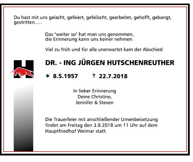 In Gedenken an unseren geschätzten Kollegen, Alumnus und Freund, nehmen wir Abschied von Dr. Hutschenreuther. Allen Angehörigen und Hinterbliebenen gilt unser aufrichtiges Mitgefühl.