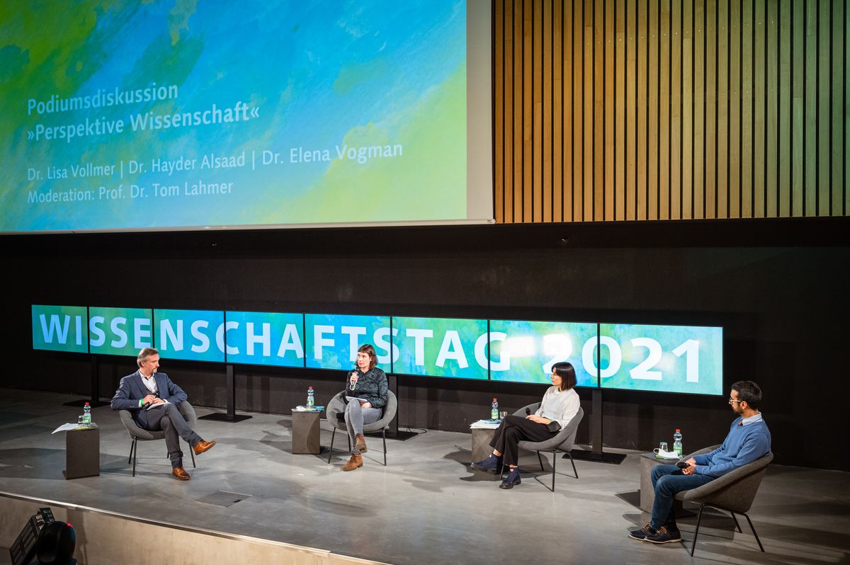 Im Anschluss stellten sich die drei Wissenschaftlerinnen und Wissenschaftler unter der Moderation von Prof. Dr. Tom Lahmer, Professor für Stochastik und Optimierung an der Fakultät Bauingenieurwesen, der Diskussion um die »Perspektive Wissenschaft« und beantworteten auch Fragen des Publikums. Dabei wurde deutlich, dass in der Postdoc-Phase vor allem ein gutes Netzwerk wichtig ist, das dabei unterstützt, erfolgreich Forschungsanträge zu schreiben. In der Diskussion zeigte sich, dass die Interdisziplinarität oftmals zu einer besonderen Herausforderung wird, wenn ein Thema sich nicht einer einzelnen Fachrichtung klar zuordnen lässt: »Manchmal muss man es etwas passend machen und ein paar Brücken bauen, um das Thema für eine neue Disziplin zu öffnen«, riet Dr. Elena Vogman. Auf Prof. Lahmers Frage, wie die Nachwuchswissenschaftlerinnen und -wissenschaftler mit der Realität befristeter Stellen umgingen, hob Dr. Lisa Vollmer ihren proaktiven Umgang mit der Situation hervor: »Ich versuche mich für mehr entfristete Stellen einzusetzen. Wenn das System wirklich reformiert wird, wird es trotz Entfristung weiterhin Wechsel in der Besetzung geben.« Dr. Hayder Alsaad wies auf die spezielle Situation internationaler Forschender hin, deren Befristung auch immer das Visum betreffe. Trotzdem sei für ihn die große Abwechslung in der Lehr- und Forschungstätigkeit ein großer Motivator die wissenschaftliche Karriere weiter zu verfolgen.
