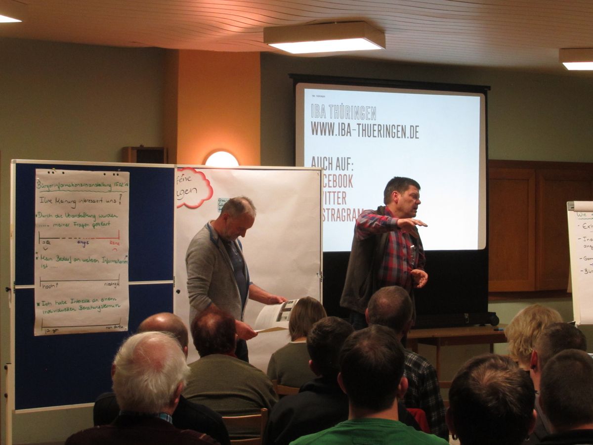 In einem weiteren Beitrag erklärte Kirsten Maier, Mitarbeiterin des ANW und der BUW, das geplante weitere Vorgehen im Umstellungsprozess. Neben individuellen Beratungen, von denen die erste im Rahmen der Bürgermeistersprechstunde am 18. Februar 2016 um 18:00 stattfindet, konnten sich die Bürger auch zu einer Exkursion zu einem existierenden Abwassersystem mit Unterdruckentwässerung melden. Die konkrete Entscheidung für ein System wird im Verbandsrat des ANW getroffen. Die betroffenen Bürger sind aufgerufen, ihre Präferenzen den jeweiligen Vertreten – für Rohrbach ist dies der Bürgermeister Ingolf Otto – mitzuteilen. Anschließend stellte Annika Broda von der Internationalen Bauausstellung Thüringen (IBA) das Konzept dieses Ereignisses dar, das in ausgewählten Projekten in Thüringen innovative Baukultur bis zum Jahre 2023 realisieren und präsentieren wird. Sie wies daraufhin, dass mit einer Entscheidung für ein innovatives Abwassersystem mit Schließung von Ressourcenkreisläufen auch Rohrbach Teil der IBA werden könnte. Nachdem Rohrbach schon den Status des IBA-Kandidaten erhalten habe, komme es nun darauf an, mit einem zukunftsträchtigen und überzeugenden Konzept eine Implementierung voranzutreiben. Diese würde eine bevorzugte Förderung des Freistaates Thüringen erhalten, und zum anderen Rohrbach nationale und internationale Aufmerksamkeit bringen.
