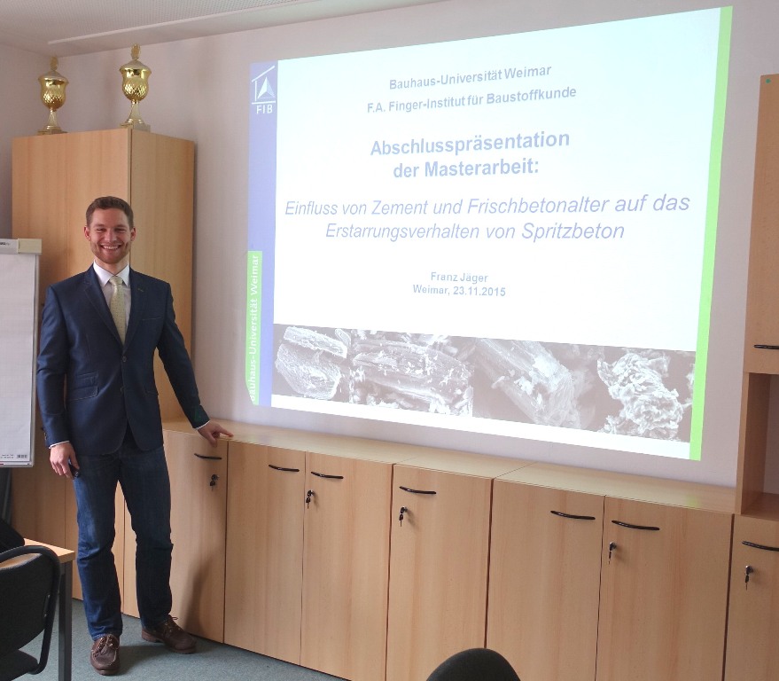 Wir gratulieren Herrn Jäger ganz herzlich zur erfolgreichen Verteidigung seiner Masterarbeit zum Thema "Einfluss von Zement und Frischbetonalter auf das Erstarrungsverhalten von Spritzbeton" (Betreuung: Dr.-Ing. J. C. Scheydt - HeidelbergCement, Dipl.-Ing. M. Müller).