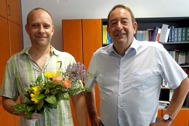 Da Herr Mark Schwesinger, dessen Bachelorarbeit zum Thema "Beitrag zur Beurteilung der Veränderung von Festigkeiten von Nadelholz nach thermischer Beanspruchung" prämiert wurde, zum Termin leider verhindert war, überreichte Herr Professor Ludwig ihm heute im Namen des Fördergebers nachträglich den Preis.