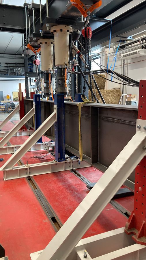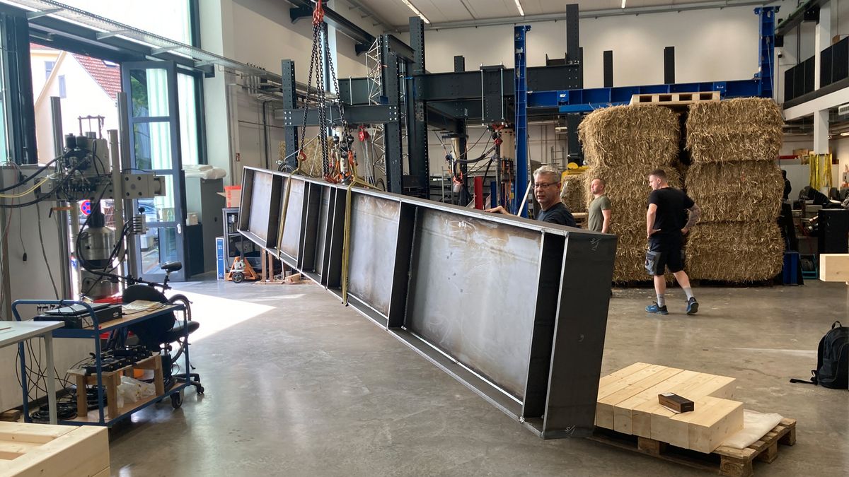 Für den Lehrstuhl Stahl- und Hybridbau fand im Rahmen des Forschungsprojektes "Tragfähigkeit geschweißter Platten aus höherfesten Stählen" in der VTE ein Biegeversuch an einem 9 m langen und 1 m hohen Stahlträger statt, um das biegeinduzierte Stegblechbeulen zu untersuchen. Mit seiner Dimension stellte der Träger eines der größten jemals in der VTE getestet Bauteile dar.