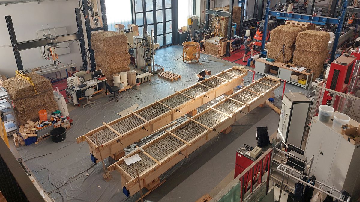 Die zwei getesteten Träger wurden in den Wochen vor den Versuchen in der Versuchshalle geschalt, betoniert und anschließend in den Versuchsstand auf dem großen Aufspannfeld eingebaut. Die Belastung erfolgte Weggesteuert mit zwei synchronisierten 1000 kN-Zylindern in einem Vier-Punkt-Biegeversuch, wobei durch den großen Zylinderabstand ein Schubversagen erzwungen werden sollte. Die Träger hielten Gesamtbelastungen von ca. 1000 kN bzw. 1800 kN stand.