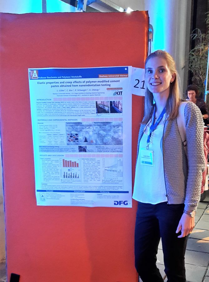 Die Forschungsthemen der Professur wurden in zwei Vorträgen sowie einem Poster vorgestellt. Luise Göbel stellte im Vortrag „Relationship between microscopic and macroscopic mechanical properties of polymer-modified concrete” experimentelle Untersuchungen aus ihrer Doktorarbeit vor. Im Vortrag „Injection mortar for anchor stocking system – a case study” wurden Ergebnisse des Forschungsprojektes Nubau-Transfer präsentiert.