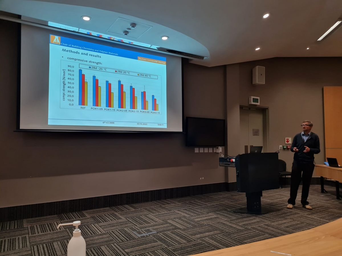 Im Anschluss nutzte Dr. Flohr die Möglichkeit auf der 6. ICCRRR, die vom 03. bis 05. Oktober auf dem Breakwater Campus der University of Cape Town stattfand, ausgewählte Forschungsergebnisse des DFG-geförderten Projektes „Experimentelle Untersuchungen und mikrostrukturbasierte Modellierung des elastischen und viskoelastischen Verhaltens von PCC in Abhängigkeit von der Temperatur“ in seinem Vortrag „The Influence of Different Modifying Polymers on the Mechanical Properties of Cement Concrete/Mortar within a Defined Service Temperature Range” zu präsentieren.
