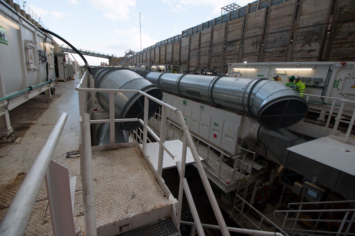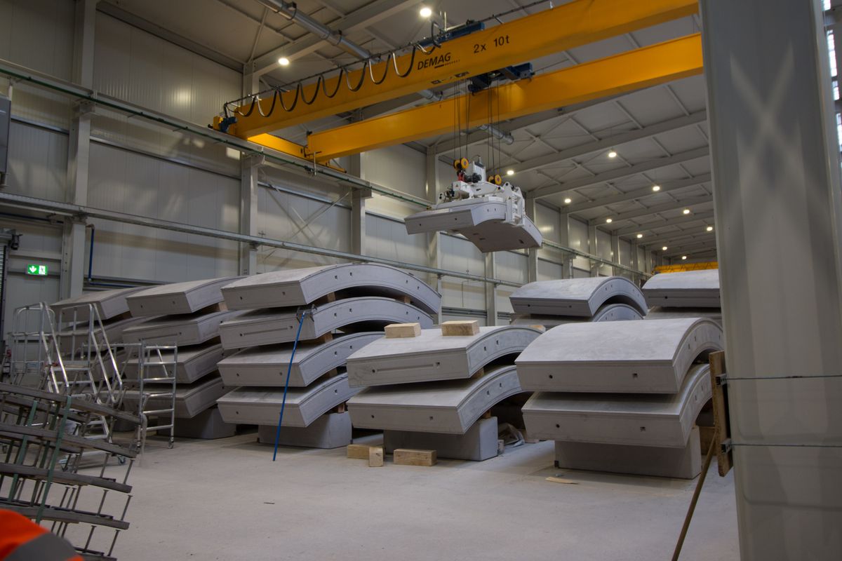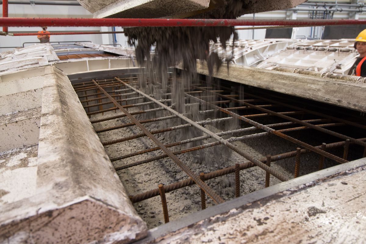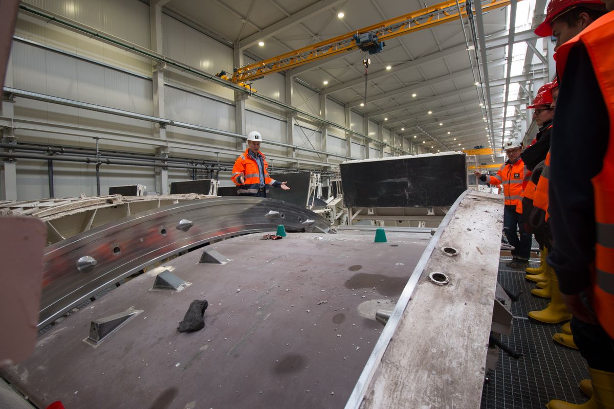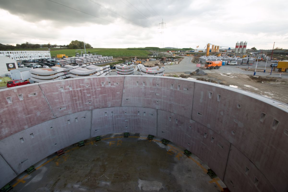 Nach einer detailreichen Präsentation der Baumaßnahme durch Herrn Dr. Groten begleiteten uns Herr Schmidt und Herr Kuhn über den Ost-Teil des weitreichenden Baustellengeländes. In der Führung wurde den Exkursionsteilnehmern die extra für den Tunnelbau errichteten Halle zur Herstellung der Tübbings samt laufender Produktionsstrecke von Herr Dr. Wagner nähergebracht. Es folgte die Besichtigung der Tunnelbohrmaschinen, von denen eine noch am selben Abend ihre Tunnelbohrarbeiten aufnehmen sollte. Abgeschlossen wurde die Exkursion mit der Besichtigung der Tübbing-Lagerflächen und sonstigen umfangreichen Baustelleinrichtungen.