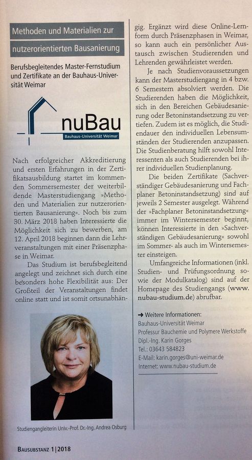 In der Zeitschrift BAUSUBSTANZ Heft 1/2018 (ISSN 2190-4278) auf der Seite 13, ist ein Bericht zum weiterbildenden Masterstudiengang "Methoden und Materialien zur nutzerorientierten Bausanierung" veröffentlicht.