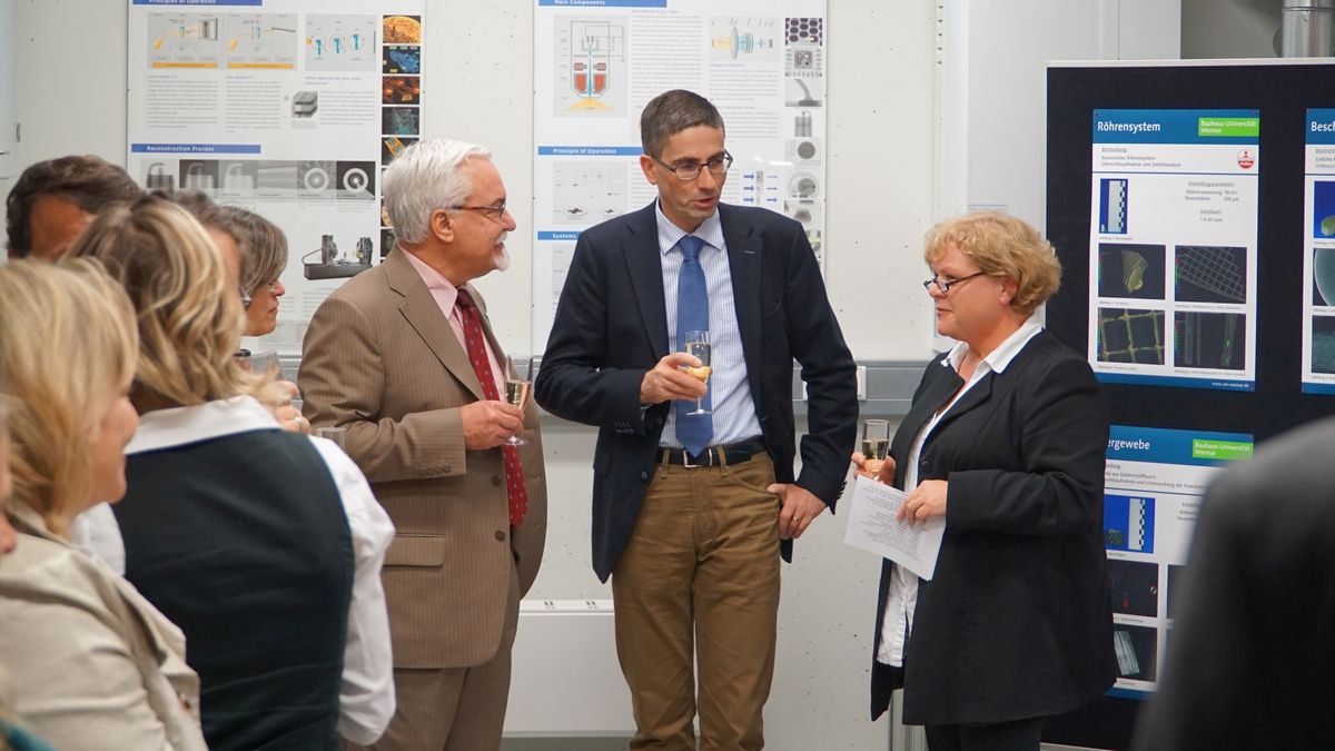Frau Professor Dimmig-Osburg (Professur Polymere Werkstoffe) stellte den Gästen kurz den Weg von der Idee zur Antragstellung bis hin zur Gerätezulassung dar. Der Rektor der Bauhaus-Universität Weimar, Prof. Dr.-Ing. Karl Beucke, hob besonders die fruchtbare Zusammenarbeit der Antragsteller auch mit den entsprechenden Dezernaten und Zentralen Einrichtungen der Universität hervor.
