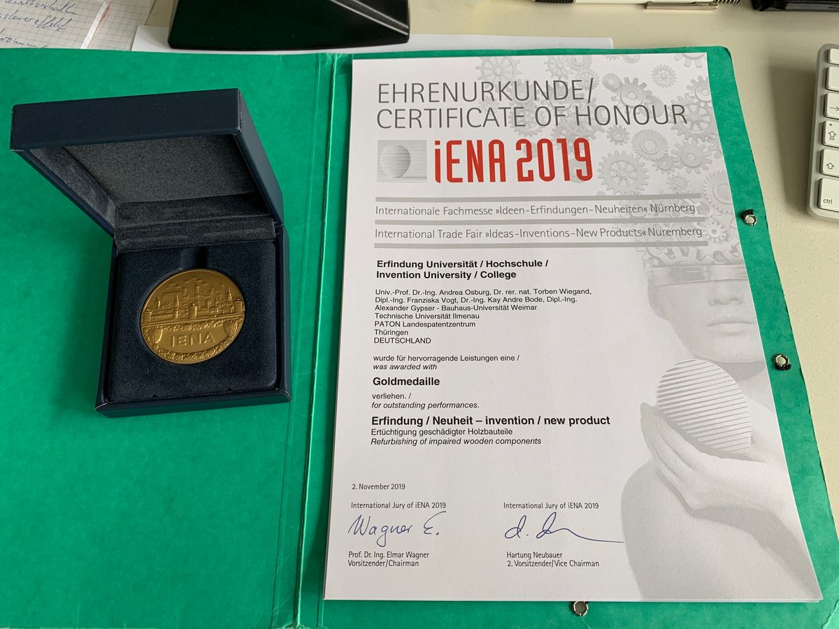 die im Rahmen der Internationalen Fachmesse "Ideen-Erfindungen-Neuheiten" mit der Erfindung "Ertüchtigung geschädigter Holzbauteile" vergeben wurde. Medaille und Urkunde wurden im Senatssaal der TU Ilmenau im Rahmen der Thüringer Auszeichnungsveranstaltung feierlich übergeben.