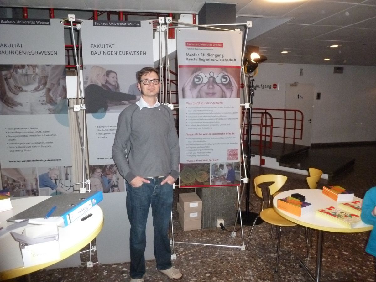 Die ca. 600 interessierten Besucherinnen und Besucher wurden an zahlreichen Beratungsständen, in Vorträgen und geführten Labortouren über das Studieren an der Bauhaus-Universität Weimar informiert. Dr. Alexander Flohr beantwortete Fragen zum Studium der Baustoffingenieurwissenschaft und führte Interessierte nach einer kurzen Präsentation der Vertiefungsrichtung Baustoffingenieurwissenschaft des Bachelorstudienganges Bauingenieurwesen [KUB] durch die Labore des F.A. Finger-Institutes für Baustoffkunde. Die zahlreichen Teilnehmer der Labortour waren von der apparativen Ausstattung des Institutes sichtlich beeindruckt.
