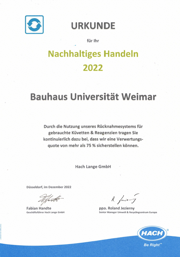 Weniger Verpackungsmüll oder die Rückgabe benutzter Reagenzien – auf vielfältige Weise versuchen wir natürliche Ressourcen zu schonen und die Umwelt zunehmend weniger zu belasten. Für ihr Engagement erhielt die Professur Bauchemie und Polymere Werkstoffe von der Hach-Lange GmbH, selbst Preisträger des Deutschen Nachhaltigkeitspreises, nun eine Nachhaltigkeitsurkunde.