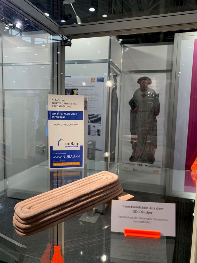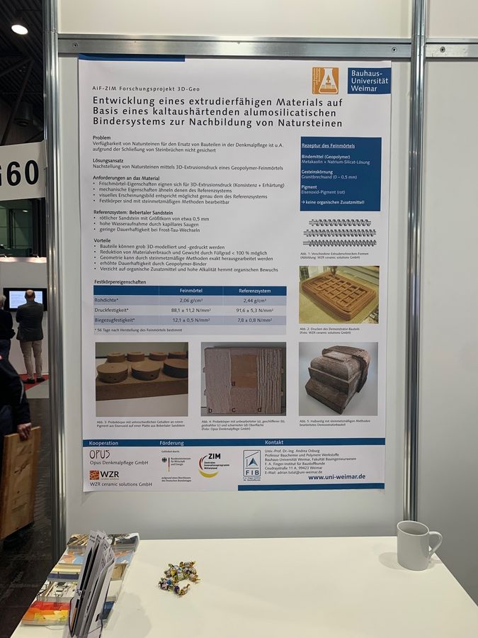 Die 14. Auflage der europäischen Leitmesse erlebte einen Ansturm von insgesamt 12.800 Besuchern aus 32 Ländern, denen 351 Aussteller aus 12 Ländern Produkte und Dienstleistungen aus allen Bereichen der Denkmalpflege und Restaurierung präsentierten. Auch die Professur Bauchemie und Polymere Werkstoffe war mit einem eigenen Messestand vertreten, an dem das Erfolgsprojekt "3D-Geo – Kunstsandstein aus dem 3D-Drucker" vorgestellt wurde.
