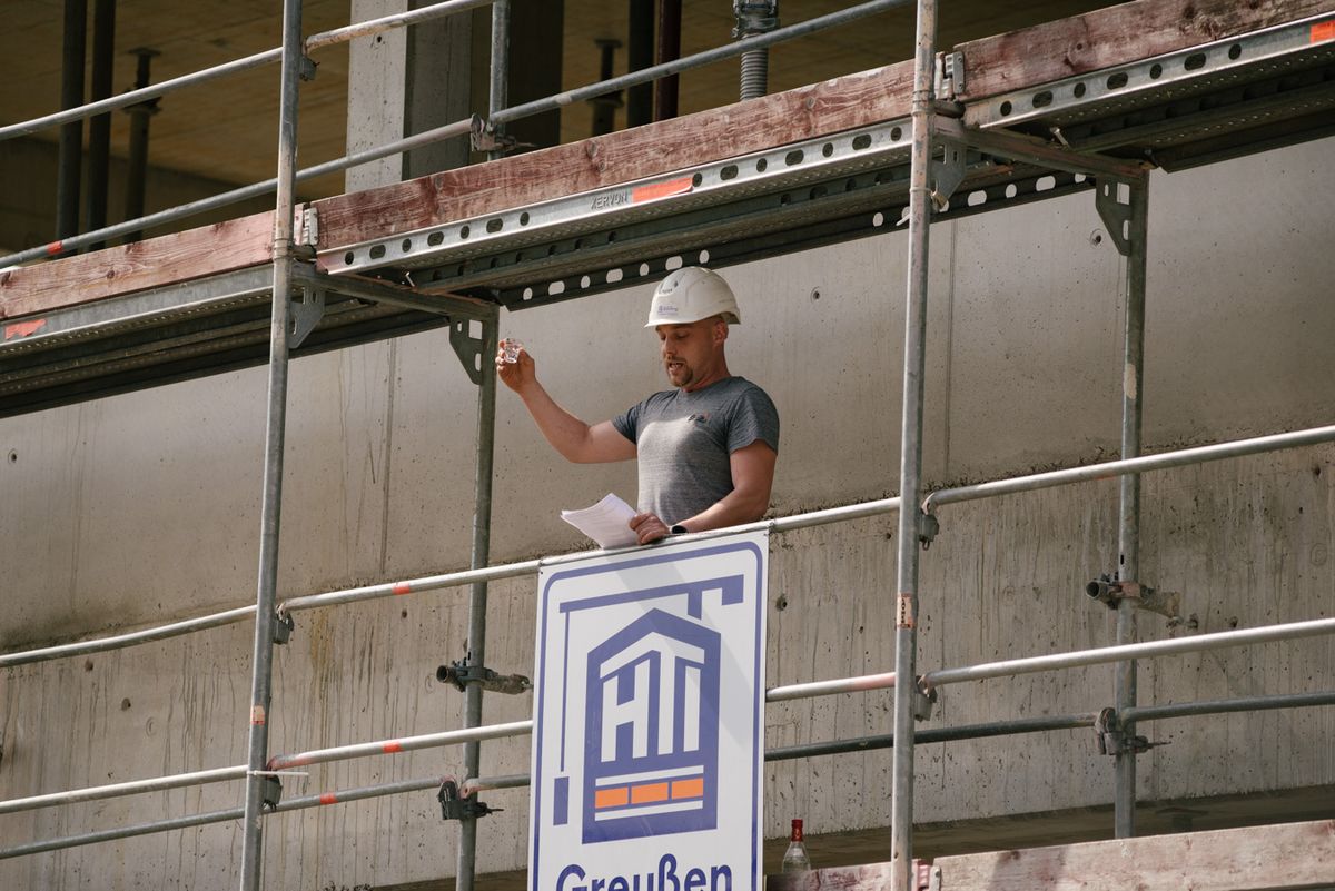 Der Polier der HTI Hoch-, Tief- und Industriebau GmbH Greußen ehrte das prachtvolle Gebäude und wünschte dem Haus Glück und Segen. Nach Zimmermannssitte sprach er den Richtspruch und trank einen Schnaps auf das Wohl der Bauherren. Danach landete das Glas an einer der Außenwände, wo es zersprang. Damit steht der weitere Bau nun unter einem guten Stern. Anschließend galt es für die Bauherren, die letzten Nägel einzuschlagen bevor der „Richtschmaus“ abgehalten wurde.