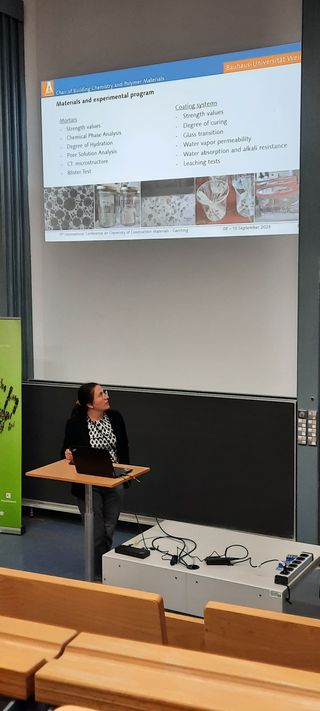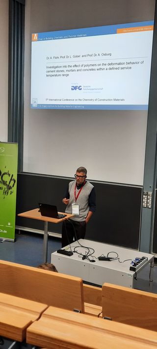 Dr. Stephan Partschefeld berichtete in seinem Vortrag „Synthesis of starch-based flow agents and characterization of dispersing performance in alkali-activated binders” über das Verhalten verschiedener Fließmittel in hoch-alkalischen Systemen. Franziska Vogt referierte unter dem Titel „Osmotic processes in the cementitious material – reactive resin coating system” über neuste Forschungsergebnisse zur Blasenbildung durch Osmose in Beschichtungssystemen. Dr. Alexander Flohr sprach über das Verhalten polymermodifizierter Betone bei unterschiedlichen Temperaturen in seinem Vortrag „Investigation of the influence of polymers in the deformation behavior of cement stone, mortars and concretes in a defined service temperature range”.