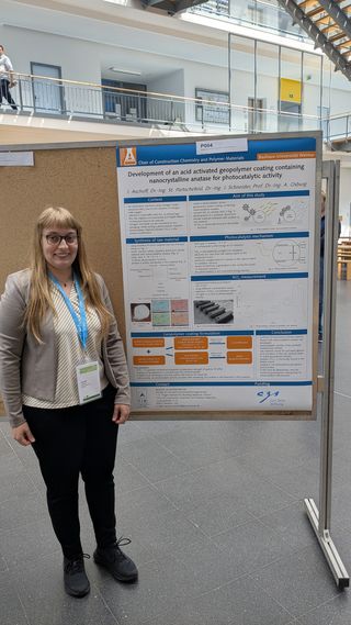 Unter den insgesamt 61 Posterbeiträgen waren Dr. Jens Schneider mit seinem Poster „Mechanical Activation of 2:1 Clays using Laboratory Attritor Mills”, Stephan Heitmann mit dem Thema „Polysaccharide based superplasticizers for calcium sulphate binders” und Jasmine Aschoff mit „Development of an acid activated geopolymer coating containing nanocrystalline anatase for photocatalytic activity” vertreten.