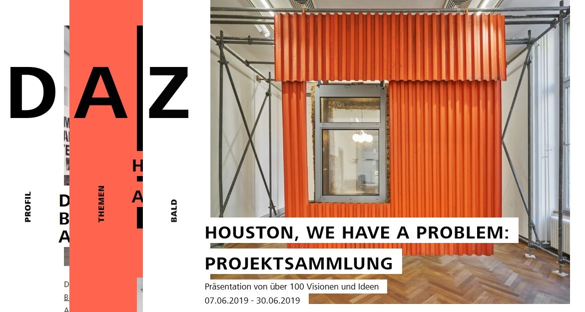 Der „Call Houston – we have a problem“ richtete sich vor allem an substanzielle Beiträge, die jenseits der bekannten Lösungen mit Wärmedämmverbundsystem helfen, „das Raumschiff Erde“ in Zeiten des Klimawandels auf Kurs zu halten. In den 100 ausgewählten Projekten sind gebaute und gedachte Ideen und Visionen aus den Bereichen Architektur und Städtebau, Gesellschaft, Energieversorgung, Verkehr und Ökonomie zu sehen. Am Y-Table-Talk wird begleitend zu den Themen Bauen im Bestand, Intelligenz des Einfachen und Bauen als materielle Ressource debattiert. Das DAZ ist eine Initiative des Bund Deutscher Architekten (BDA) und fungiert als Ideenlabor, ein Ort des Austauschs, der Vermittlung und Debatte.