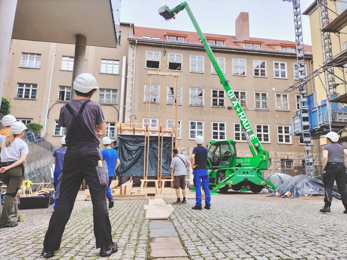 In sechs intensiven Bauwochen wurde der BEH anschließend an die Ausführungsplanung von 19 Studierenden im Sommersemester 2023 am Campus in der Coudraystraße errichtet. Den Rohbau wollen wir nun feierlich einweihen.