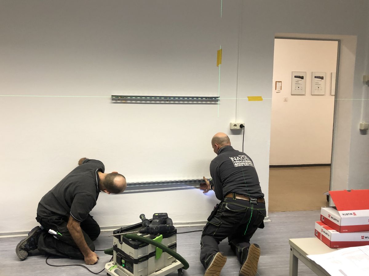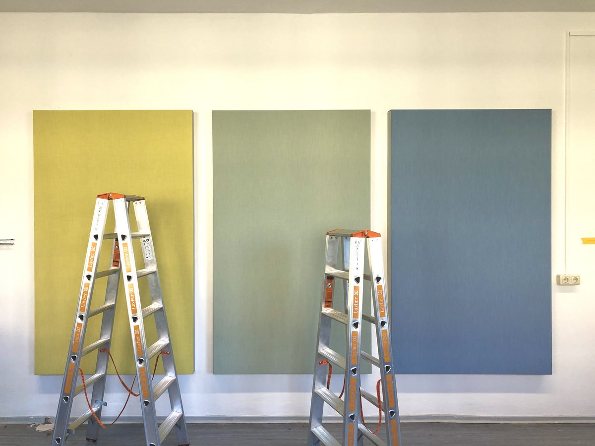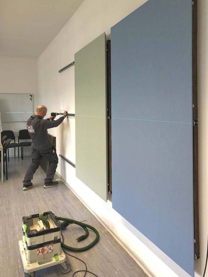 Unter der Betreuung der Professur Bauphysik findet derzeit die Installation der regenbogenfarbenen Akustikplatten im Raum 115.1 in der Coudraystraße 11a statt, der primär für Seminare und Besprechungen genutzt wird.