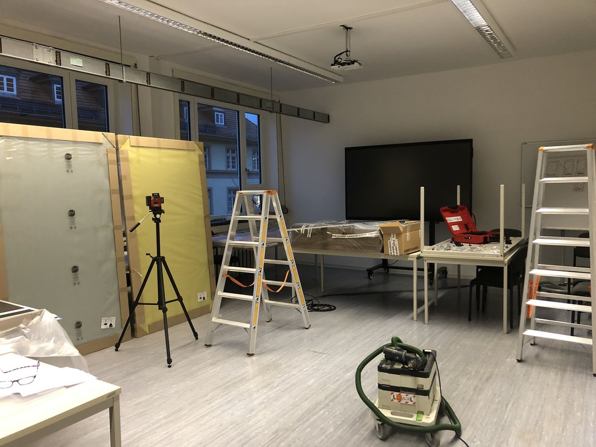 Nach einer intensiven zweijährigen Vorbereitungsphase, wobei die Studenten des Seminars 'Akustische Gebäudeplanung' mitgewirkt haben, sowie nach intensiver Rücksprache mit verschiedenen Akustikfirmen und großzügiger Unterstützung durch das Servicezentrum Liegenschaften, wird der Raum nun akustisch gestaltet. Durch diese Aufrüstung wird nicht nur die Ästhetik des Raums verbessert, sondern auch ein geeigneter Raum für Seminare und Messungen im Rahmen der Akustisches Gebäudeplanung geschaffen.