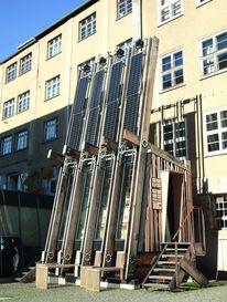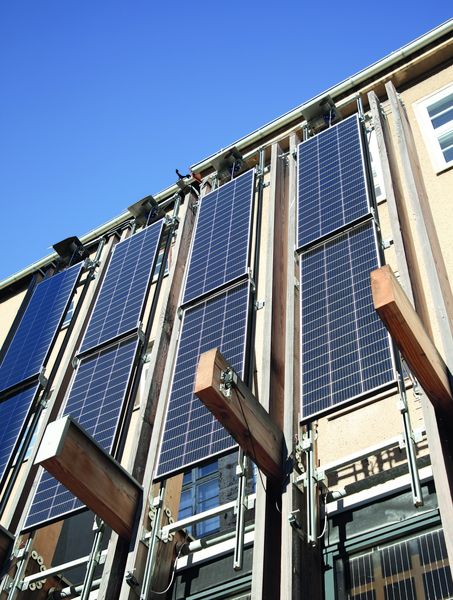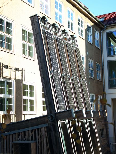 Nach intensiver Vorplanung, Fertigung und Montage ist nun die Photovoltaikanlage am Hub installiert. Acht Module mit einer Gesamtfläche von etwa 8 Quadratmetern liefern eine maximale Gesamtleistung von 1,6 Kilowatt peak. Das Besondere: Aufgrund ihrer außergewöhnlichen Platzierung an den hohen Masten des Gebäudes war es notwendig, zur Reduzierung der Windlast ihre Windangriffsfläche bei Bedarf herunterzufahren – im wahrsten Sinne des Wortes. Damit bei zu starkem Wind keine Stabilitätsgefahr für das Gebäude entsteht, sind sämtliche Module verschiebbar ausgeführt. Das alles passiert vollautomatisch: Ein Sensor misst dauerhaft die aktuelle Windgeschwindigkeit. Sobald der Wind zu stark wird, übermittelt er diese Information an einen Motor, welcher daraufhin die Module herunterfährt.