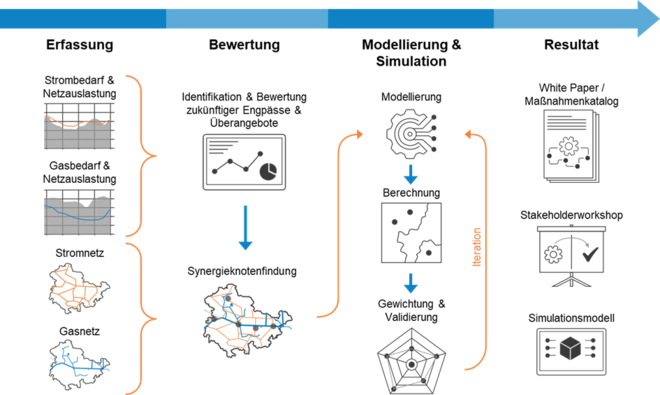 Das Vorhaben hat das Ziel, ein dynamisches Modell für eine kombinierte Strom-/H2-Infrastruktur in Thüringen zu entwickeln und anhand von verschiedenen Netzbetriebsszenarien zu validieren, wie die erforderliche Flexibilisierung vor dem Hintergrund der nationalen Vorgaben zur Dekarbonisierung technisch, organisatorisch und energierechtlich realisiert werden kann. Die geplante Vorgehensweise ist in Abbildung 2 dargestellt.