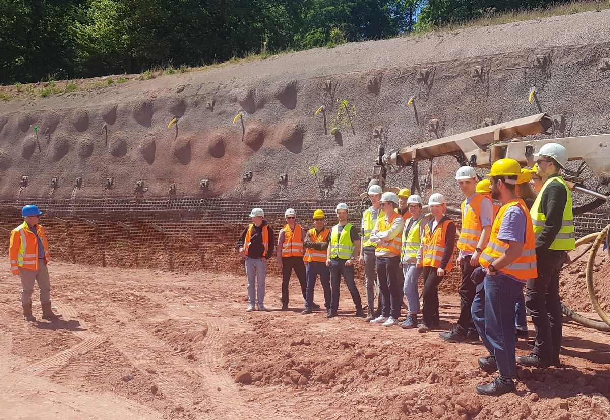 Am 31.05.2023 führte die erste Exkursion zum Neubau der A44 zwischen Sontra und Herleshausen. Der sehr anspruchsvolle letzte Bauabschnitt bot mit zahlreichen sich im Bau befindlichen Ingenieurbauwerken (Tunnel, Brücken) die Möglichkeit vielseitige Einblicke zu gewinnen. Unter der sehr informativen Führung des Projektleiters Dr. Franz von der DEGES (Deutsche Einheit Fernstraßenplanungs- und -bau GmbH) konnten die Studierenden bei einer ausführlichen Befahrung des kompletten Bauabschnitts spannende Einblicke in geotechnische Problemstellungen wie z.B. Tunnelausbau, Böschungssicherungen durch Bodenvernagelung und Bodenverbesserung in Form von Kalkeinfräsung oder Auflastschüttung erleben.