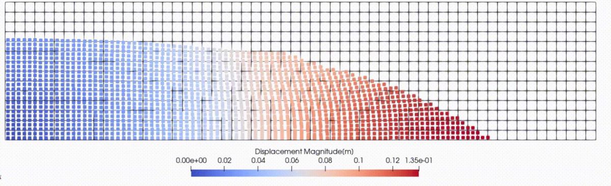 Als Grundlage diente ein auf dem Rütteltisch der Professur durchgeführter kleinmaßstäblicher Versuch zur Böschungsrutschung unter Erdbebenanregung. Darauf aufbauend wurde jeweils ein Modell der Böschung mit der Finite Elemente Methode (FEM) sowie der Material Point Methode (MPM) erstellt, um das beobachtete Versagen numerisch nachzubilden. Die Erfassung großer Deformationen stellt aufgrund von großen Netzdeformationen eine Herausforderung für die numerische Modellierung dar. Während in der FEM daher auf die Verwendung eines "Updated Lagrangian" Schemas zurückgegriffen wurde, lernten die Teilnehmenden mit der MPM eine speziell für diese Herausforderung entwickelte alternative Methode kennen.