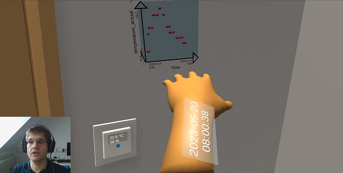 Ein digitaler Zwilling stellt eine Verbindung zwischen einem realen Objekt und der digitalen Welt dar. Der Zwilling besteht aus einem digitalen Modell, das automatisch mit Daten aus der realen Welt aktualisiert wird und auch automatisch Änderungen aus der digitalen Welt in die reale überträgt. Wir haben einen solchen Zwilling erstellt. Im zweiten Schritt legen wir den Fokus auf den automatisierten Datenaustausch. Sensoren für Temperatur und Luftfeuchtigkeit erfassen Daten aus der realen Welt; diese Daten werden gespeichert und in der VR-Umgebung angezeigt. Zusätzlich, kann mit Hilfe von Heizungsthermostaten in der virtuellen Welt die gewünschte Raumtemperatur festgelegt werden. Diese Information wird an die Thermostate in der realen Welt übertragen.