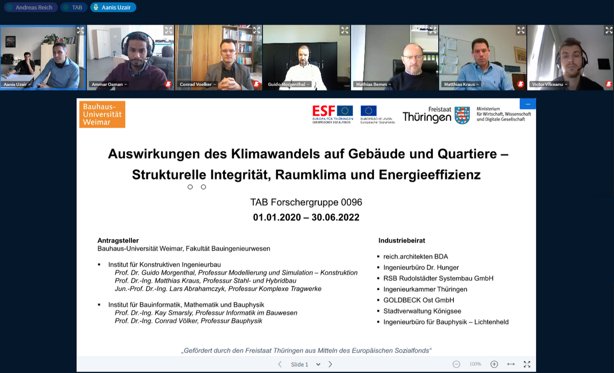 Am 12.11.2020 organisierte die Professur das 2. Arbeitstreffen der Forschergruppe "Auswirkungen des Klimawandels auf Gebäude und Quartiere". Am Treffen nahmen die Vertreter der Industriepartern, der TAB und Mitglieder der Arbeitsgruppe der Bauhaus-Universität Weimar teil. Im Rahmen der Vorträge wurden Ergebnisse aus der Klimadatenanalyse und der Extremwertstatistik sowie erste Anwendungen hinsichtlich der Konsequenzen, wie z.B. den Raumkomfort diskutiert.