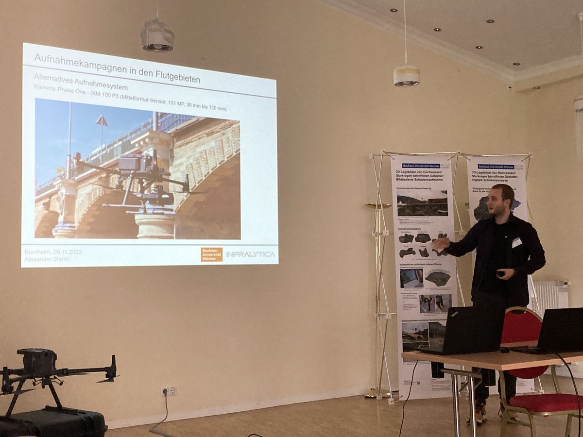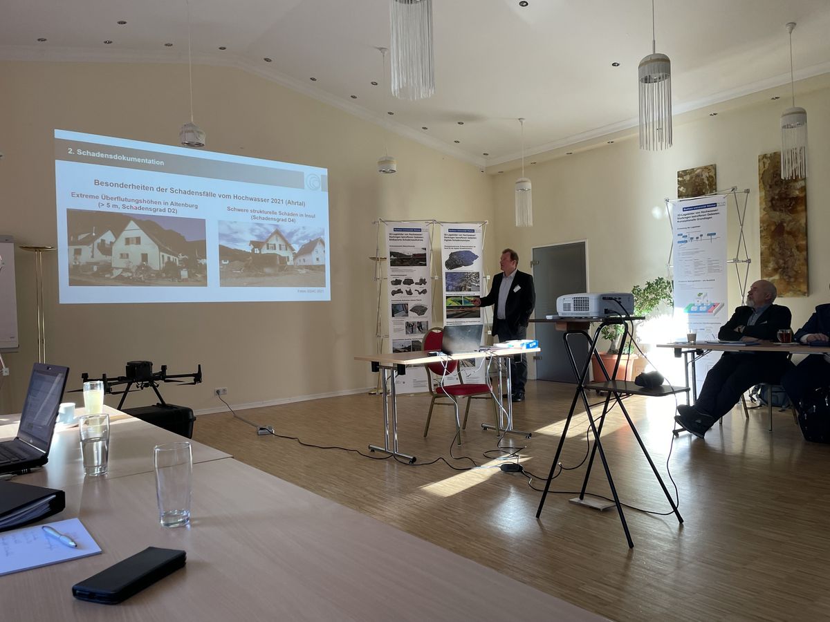 Im Rahmen des Workshops wurden Ergebnisse des Projektes 3D Lagebilder im Rahmen von Fachvorträgen und auf Postern präsentiert und zu den Themen 3D und „digitale" Lagebilder/ -karte, Schadensdokumentation, Schadensprognose, Befliegung mittels UAV mit Bezug zum Hochwasser 2021 in NRW und RLP intensiv mit Vertretern von THW, KVK, MHKBD, BBK, AöR und LfULG sowie den Universitäten RWTH Aachen und Potsdam diskutiert.