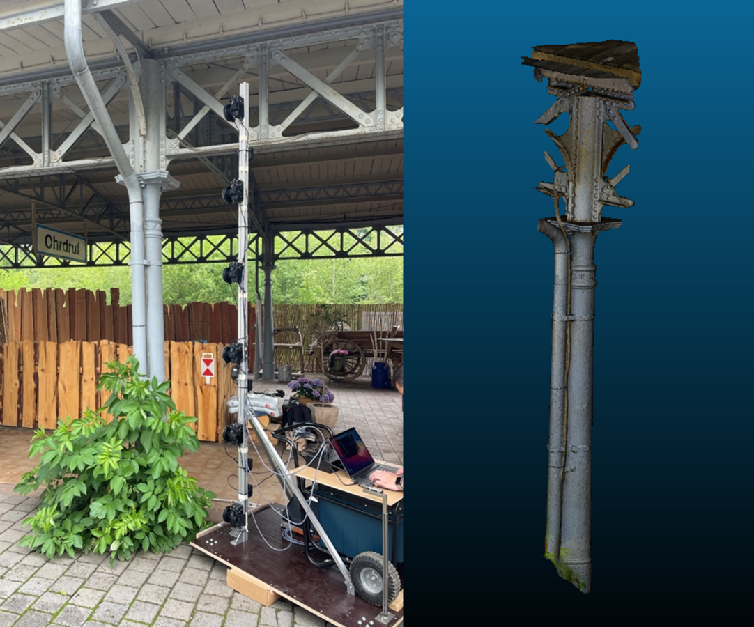 Für die photogrammetrische Aufnahme von zwei historischen Stützen am Ohrdrufer Bahnhof im Rahmen des Projektes HeriTech wurde in Zusammenarbeit mit der Versuchstechnischen Einrichtung (VTE) ein in der Höhe flexibles Aufnahmestativ entwickelt, das es ermöglicht, mehrere Kameras vertikal übereinander anzuordnen. Die einzelnen Kameras sind dabei variabel über die Höhe verstellbar. Das Stativ ist an einer verfahrbaren Unterkonstruktion befestigt, sodass es schnell und einfach an die gewünschten Positionen geschoben werden kann. Die Kameras werden an einen Rechner angeschlossen, an dem die Einstellungen vorgenommen und Bilder direkt angeschaut werden können. Über den Rechner werden darüber hinaus alle Kameras zeitgleich ausgelöst. Mit Hilfe der Aufnahmen wurde eine 3D-Rekonstruktion der Stützen erstellt, welche die Grundlage der weiteren Projektarbeit darstellt.
