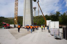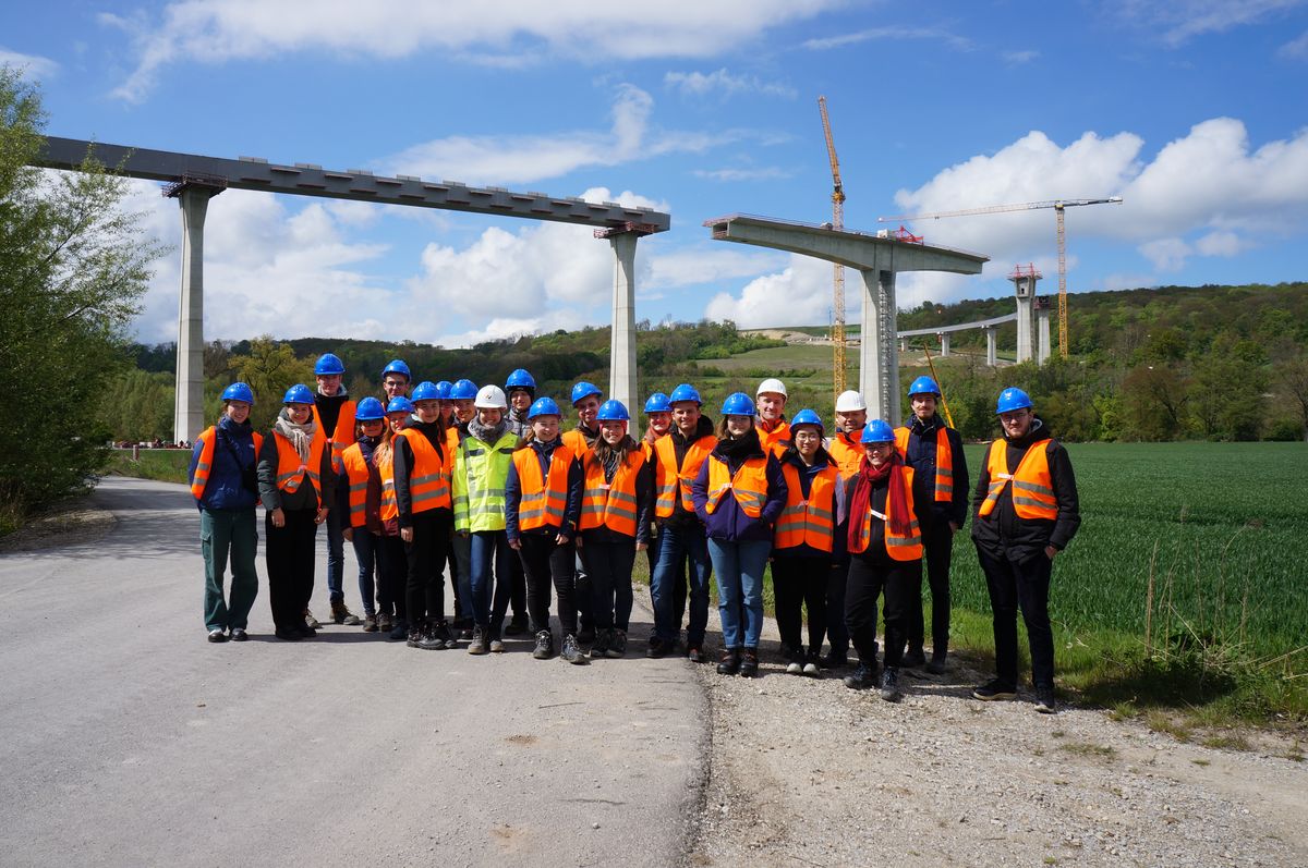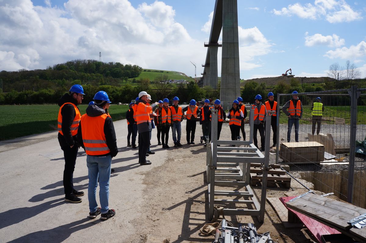 Bei der von KREBS+KIEFER geleiteten Exkursion konnten den Studierenden gleich mehrere Besonderheiten gezeigt werden, da für den Überbau verschiedene Bauverfahren (Freivorbau und Taktschieben) sowie mehrere Materialen im Überbau (Spannbetonhohlkasten und Stahl-Beton-Verbundquerschnitt) mit entsprechenden Sonderlösungen des kraftschlüssigen Verbunds eingesetzt wurden. Neben der Besichtigung des Bauwerks gab es zu Beginn auch einen kurzen Fachvortrag zur Übersicht des Bauwerks und Bauablaufs.