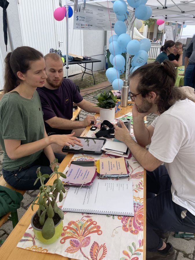 Dieses Projekt, das sich mit der Frage der Textilsortierung und der Kreislaufwirtschaft auseinandersetzt, fand seinen Platz zwischen der VertiKKA und der beliebten Seifenblasenecke für Kinder im Innenhof der Coudraystraße 10. BesucherInnen wurden eingeladen, sich aktiv an Gesprächen über den derzeitigen Umgang mit textilem Abfall, die Textilsortierung und die Herausforderungen der Fast-Fashion-Industrie zu beteiligen. Zudem gab es die Gelegenheit mit einem Nahinfrarotspektroskopie-Handgerät textile Materialzusammensetzungen spielerisch zu identifizieren und somit vorhandene Technologie zu erfahren. Künstlerische Unterstützung erfolgte durch die Bereitstellung eines Sonnensegels aus Alttextilien von einer ehemaligen Architekturstudentin der Bauhaus-Universität Weimar.