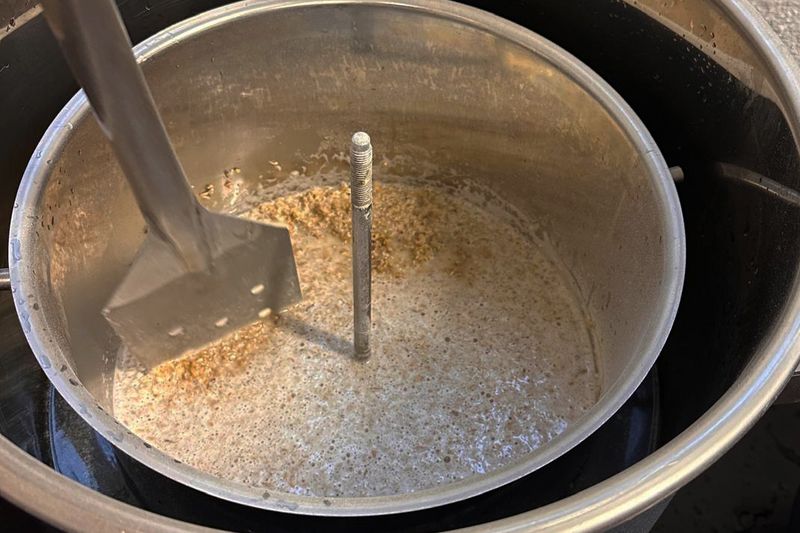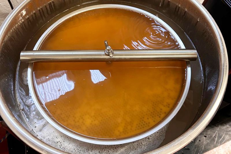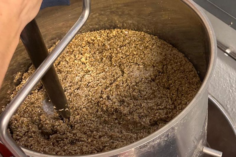 Um die im Malz enthaltene Stärke in Zucker umzuwandeln, kochten wir das geschrotete Malz mit Wasser auf. Dieser Prozessschritt nennt sich „Maischen“ und dauerte etwa 90 Minuten. Anschließend folgte das Läutern, bei dem der Biertreber (die festen Bestandteile) vom Wasser getrennt wird.