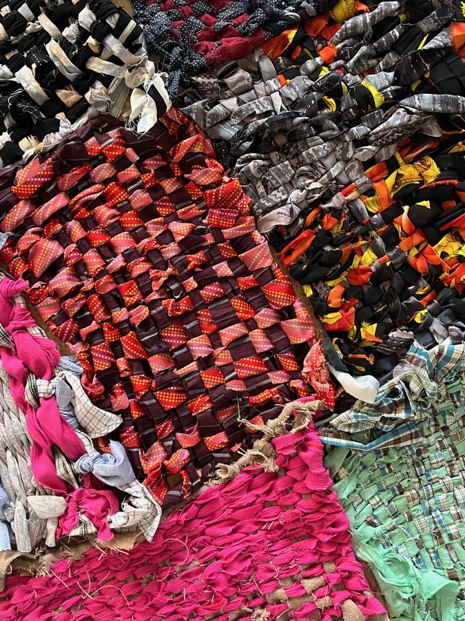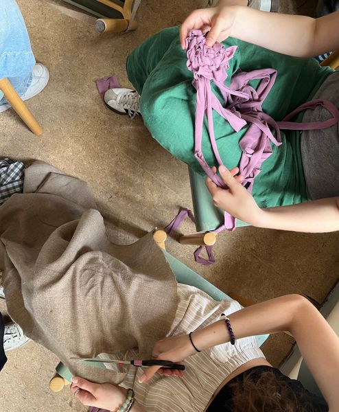 Begleitet wurde das Ganze durch eine Besichtigung aktueller Sortierversuche im Technikum und der Vorführung des NIR Handgeräts zur Materialerkennung. Ergänzt wurde der Besuch durch eine Führung der Textilwerkstatt an der Universität. Den Abschluss bildete ein kreativer Workshop mit der Textilkünstlerin Anne Marx. Hier erhielten die Schüler*innen die Möglichkeit, Alttextilien aus dem Technikum durch Flecht- und Webtechniken in neue Nutzgegenstände wie Sitzkissen oder Türvorleger zu verwandeln und den Alttextilien somit einen weiteren Lebensweg zu ermöglichen.