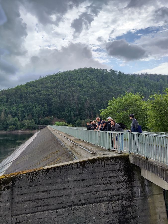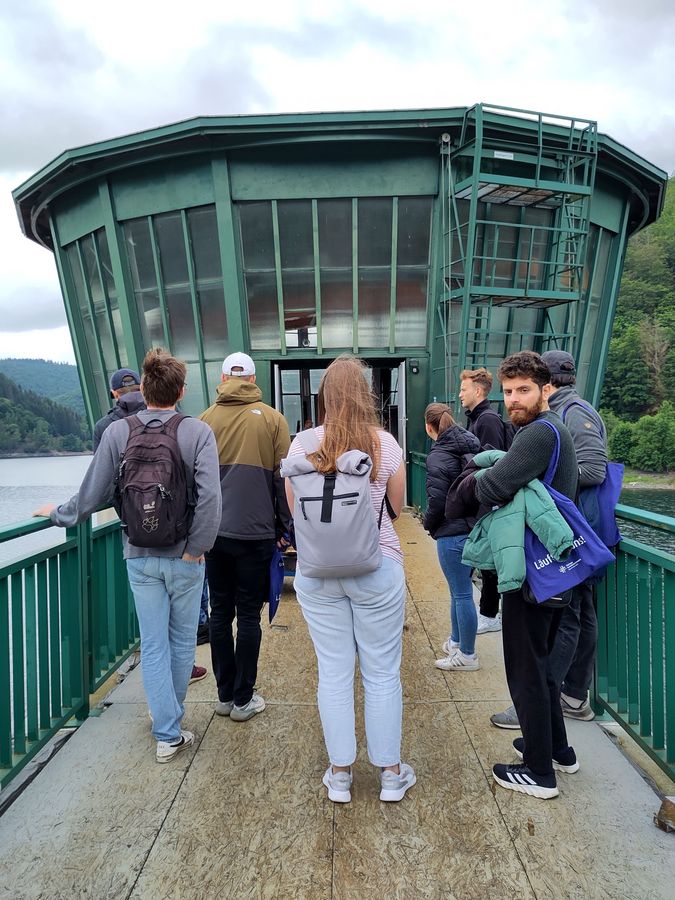 Es geht über bergiges Gelände der "Gabel", hoch auf die Krone des Nordtales zur imposanten und von Mischwald umgebenden Stauanlage Schönbrunn. Dort angekommen, treffen wir am Absperrbauwerk den Leiter der Stauanlagen Mittelthüringen, Herrn Jens Sauerwein. Durch Ihn werden die Studierenden über alle Details der Talsperre als Trinkwasserreservoire, aber auch die Herausforderungen beim Talsperrenmanagement, den Betrieb und die Instandhaltung eingeweiht. Neben den relevanten Einheiten der Talsperre Schönbrunn, hier der Leitwarte, dem Absperrbauwerk, dem Entnahmeschacht sowie dem imposanten Kontrollgang des Absperrbauwerkes, gab es auch Einblicke in die bevorstehende Generalinstandsetzung der Talsperre Schönbrunn und erste laufende Maßnahmen.