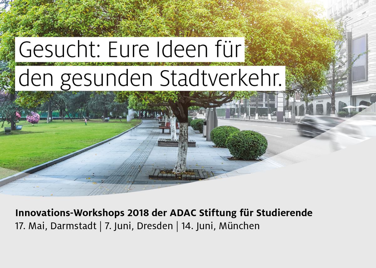 GESUCHT werden Eure innovativen Ideen für einen gesunden Stadtverkehr bei dem Innovations-Workshop der ADAC Stiftung an der TU Dresden. BELOHNT werden die Teilnehmer mit einem professionelles Innovations-Coaching sowie 3 x 500 € Preisgeld für die besten Teams und die Chance auf Förderung eurer Studien-, Bachelor-, Master- oder Doktorarbeiten. BEWERBT Euch jetzt auf www.stiftung.adac.de!