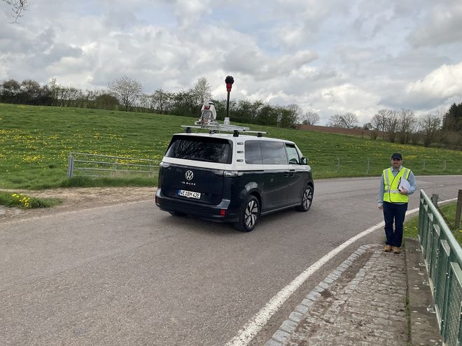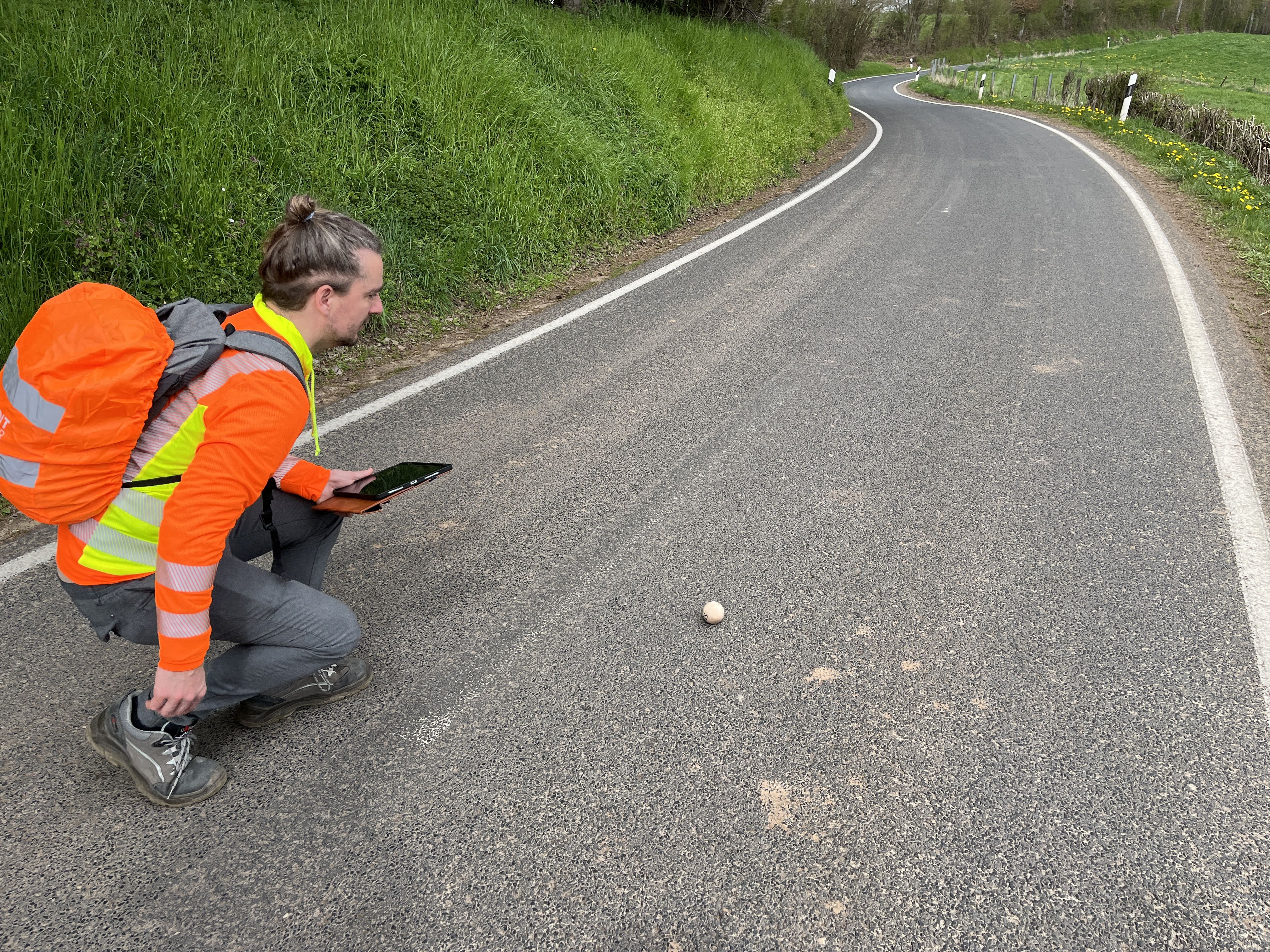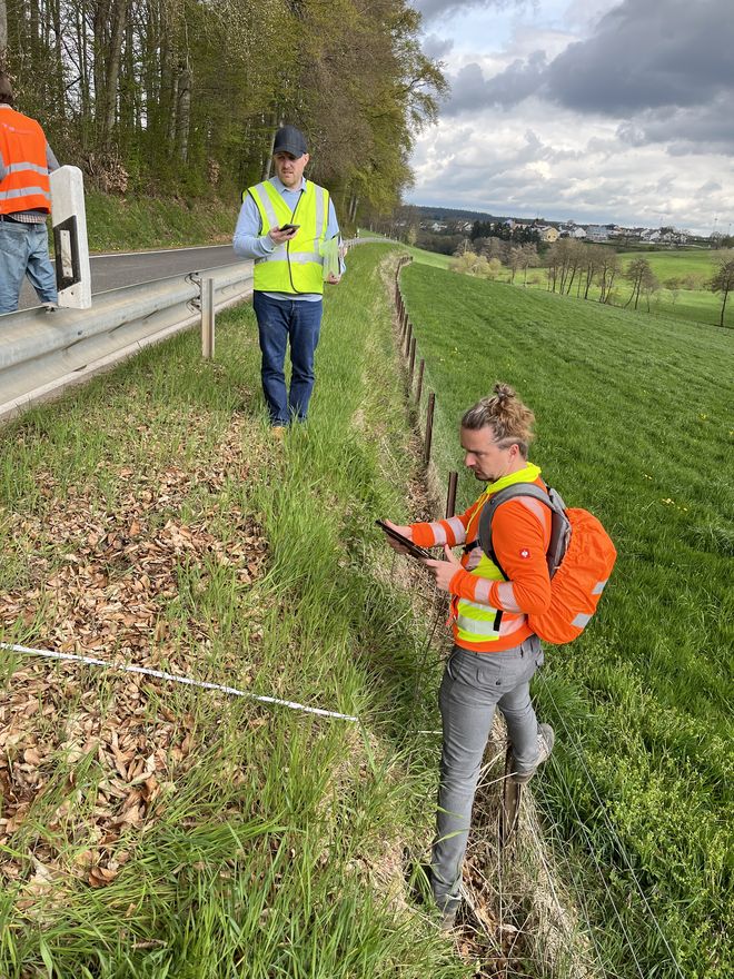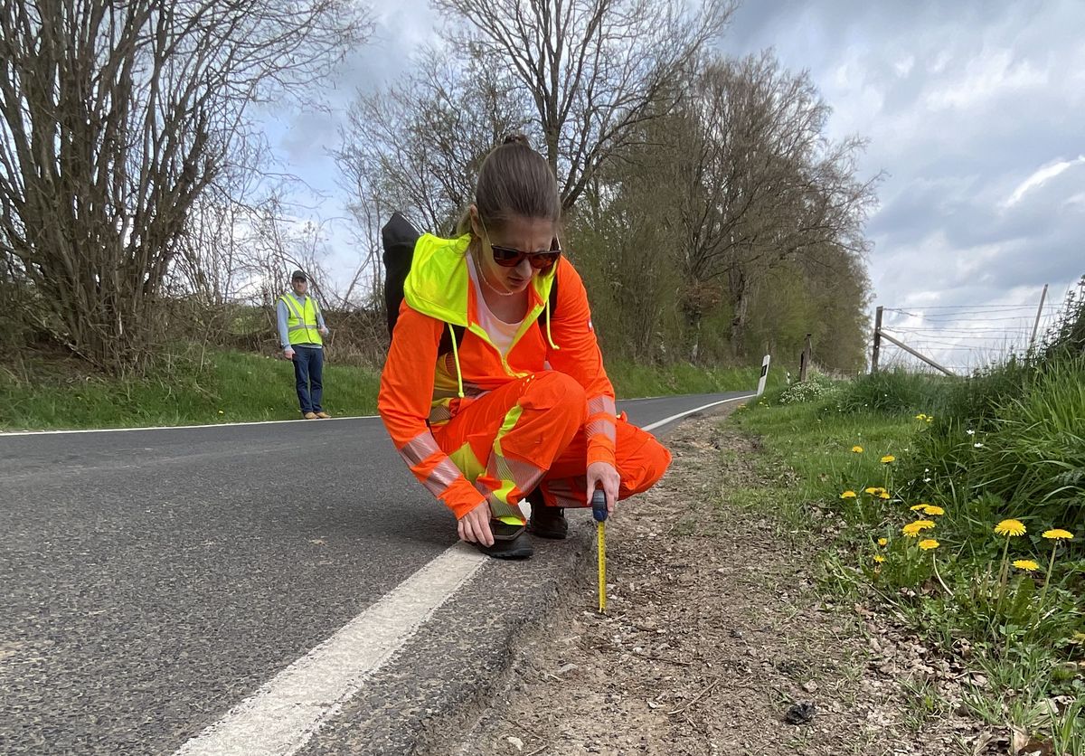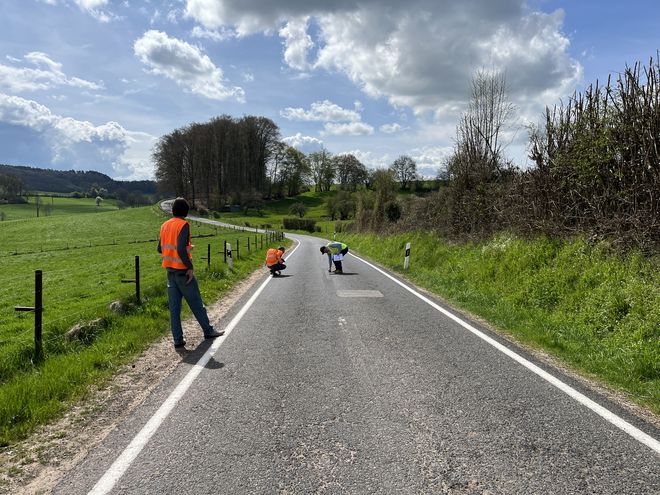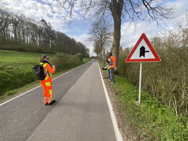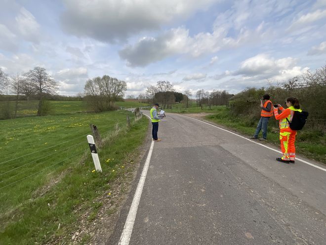 Auf einer Landstraße zwischen Buschdorf und Boevange-sur-Attert bewerteten Rebekka Kramm, Wido Hamel und Julian Pracht den Bestand der Straße anhand ihrer Verkehrssicherheit. Hintergrund sind geplante Änderungen, die aus Sicht der Straßenbauverwaltung notwendige Verbesserungen der Verkehrssicherheit mit sich bringen sollen. Um einschätzen zu können, ob die Planung die Verkehrssicherheit erhöht, maß das Team der VSP die Fahrbahnbreite an verschiedenen Stellen sowie die Bankettbreite. Sie erfassten Hindernisse im Seitenraum, testeten die Querneigung der Fahrbahn und scannten den Straßenraum mit LiDAR zur Erstellung eines dreidimensionalen Abbilds.