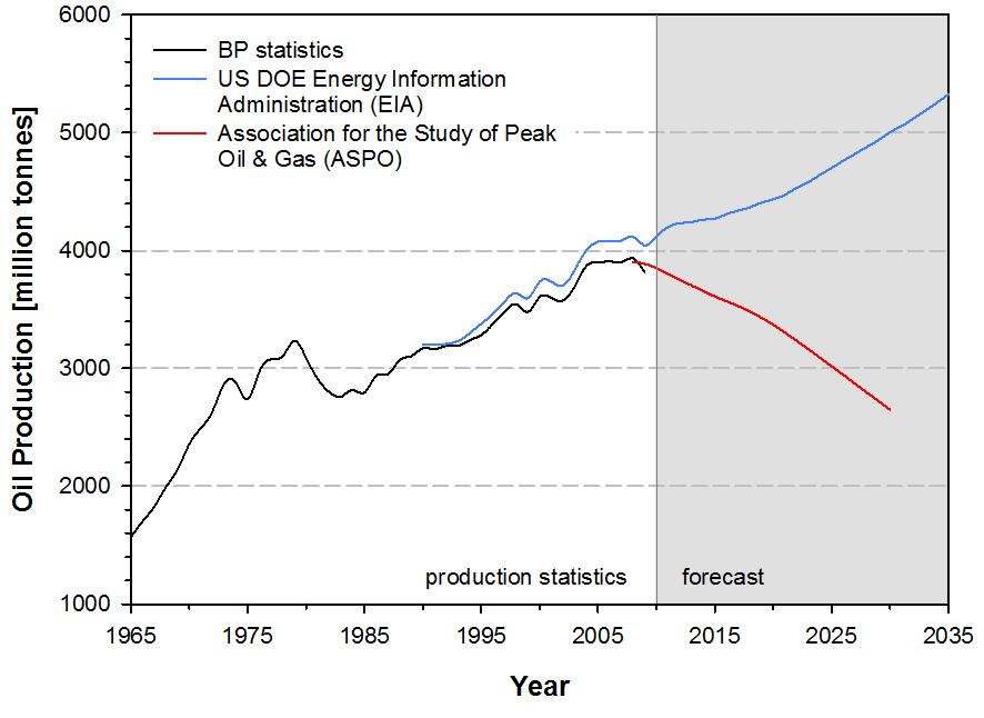 Abbildung 4 zeigt die von BP [4] seit 1965 vorgelegten Statistiken über die globale Ölproduktion in Verbindung mit den Vorhersagen der Association for the Study of Peak Oil and Gas (ASPO) [5], die auf einen stetigen Rückgang der Produktion ab 2010 hindeuten. Dies steht im starken Kontrast zu den Daten, die vom U.S. Department of Energy (DOE) Energy Information Administration (EIA) [6] veröffentlicht wurden, die auch in Abbildung 4 für den IEO2010-Referenzfall enthalten sind. Dieses Szenario sagt einen stetigen Anstieg der Produktion nach dem Trend der letzten 30 Jahre voraus. Es muss jedoch erwähnt werden, dass die EIA-Daten auch flüssige Biokraftstoffe (Ethanol, Biodiesel) enthalten. Dies zeigt sich in der Abweichung zwischen diesen Daten und den BP-Daten für die historischen Produktionsstatistiken. Dennoch sagen die EIA-Daten voraus, dass der Anteil der nichtkonventionellen Quellen, zu denen neben Biokraftstoffen auch Ölsand, extraschweres Öl, Kohle-zu-Flüssigkeiten, Gas-zu-Flüssigkeiten und Schieferöl gehören [6], im Jahr 2035 nur etwa 12 % der Gesamtproduktion ausmachen wird. Dies entspricht eindeutig nicht den ASPO-Vorhersagen. Geht man davon aus, dass die ASPO-Daten für die Ölproduktion aus konventionellen Quellen korrekt sind, und die EIA-Daten die zukünftige Nachfrage angemessen vorhersagen, dann würde es 2030 eine Angebotslücke von 2350 Millionen Tonnen jährlich geben. Wenn dies beispielsweise mit Biodiesel aus Palmöl überbrückt würde, wäre eine Plantagenfläche erforderlich, die 133 % der Fläche der Europäischen Union oder 68 % der Fläche Brasiliens entspricht.