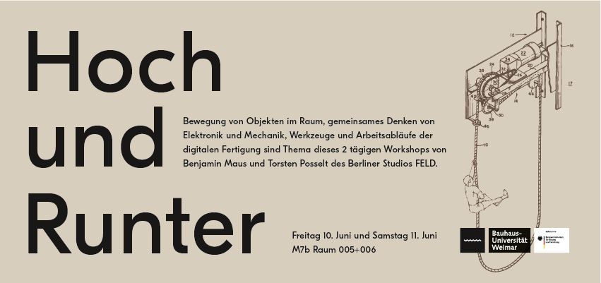 Bewegung von Objekten im Raum, gemeinsames Denken von Elektronik und Mechanik, Werkzeuge und Arbeitsabläufe der digitalen Fertigung sind Thema dieses zweitägigen Workshops von Benjamin Maus und Torsten Posselt des Berliner Studios FELD. In Gruppen werden Konzepte für kleine autarke Einheiten entwickelt, die sich an Schnüren hoch und runter bewegen oder an einer Schnur herablassen können. Die kleinen Apparate sollen sich durch ihr Verhalten, ihre Aktionen und ihren Ausdruck voneinander unterscheiden. Die Konzepte werden mit gängigen Materialien und Teilen so schnell wie möglich umgesetzt, verbessert und dokumentiert. Ziel ist die Einführung in das Bauhaus Form & Funktion Labor und dessen Möglichkeiten der schnellen Entwicklung von Prototypen.