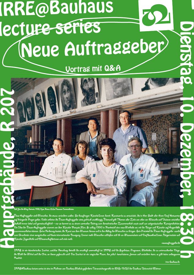 Unter dem Titel »IRRE@bauhaus« präsentiert das IRRE Institut mehrere Veranstaltungen an der Bauhaus-Universität Weimar im Wintersemester 2019/2020. Am 10. Dezember lädt der Verein »Neue Auftraggeber« zu einem Vortrag mit anschließendem Q&A.