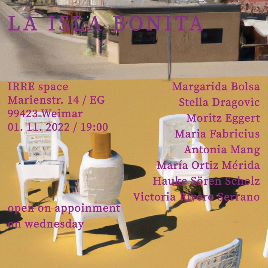 Madonnas Single »la isla bonita« aus dem Jahr 1987 ist die geistige Einstimmung auf die erste Ausstellung im IRRE SPACE im Rahmen des Kurses »AUSSTELLUNGEN MACHEN MACHEN MACHEN!!!« im Wintersemester 2022/23 an der Bauhaus-Universität Weimar.