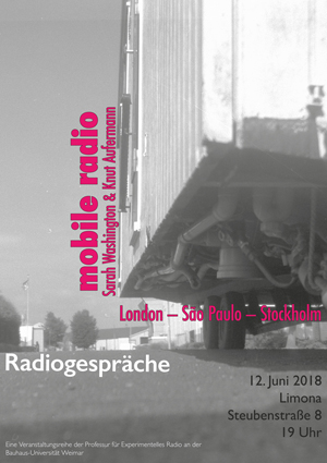 Am Dienstag, 12. Juni 2018, 19 Uhr kommt das international arbeitende Künstlerduo Mobile Radio in den Glaskasten der Limona, um dort im Radiogespräch über ausgewählte Projekte der letzten Jahre zu sprechen. Interessierte sind herzlich willkommen!