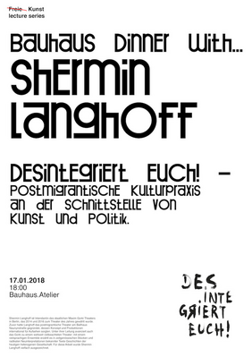 im Rahmen der Freien Kunst lecture series begrüßt die Fakultät Kunst und Gestaltung am Mittwoch, 17. Januar 2018, Shermin Langhoff zu einem Bauhaus Dinner. Sie wird einen Vortrag über Postmigrantische Kulturpraxis an der Schnittstelle von Kunst und Politik halten. Interessierte sind herzlich eingeladen.