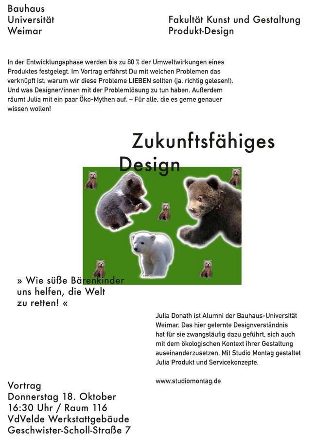 In der Entwicklungsphase werden bis zu 80 % der Umweltwirkungen eines Produktes festgelegt. Im Vortrag erfährst Du, mit welchen Problemen das verknüpft ist; warum wir diese Probleme LIEBEN sollten (ja, richtig gelesen!). Und was Designerinnen und Designer mit der Problemlösung zu tun haben. Außerdem räumt Julia mit ein paar Öko-Mythen auf. – Für alle, die es gerne genauer wissen wollen!