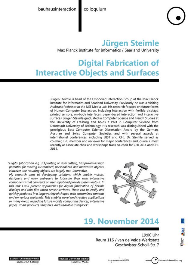 Im Rahmen der interdisziplinären Veranstaltungsreihe »bauhausinteraction.colloquium« an der Bauhaus-Universität Weimar begrüßen wir im als zweiten Gast Jürgen Steimle zu einem Gespräch über »Digital Fabrication of Interactive Objects and Surfaces«.