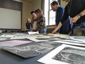 Zur Vorbereitung der Eignungsprüfung im Studiengang »Visuelle Kommunikation« findet ein Mappenberatungstermin in der Gruppe statt, zu dem jeder Teilnehmer seine Mappe mitbringen und vorstellen sollte.
